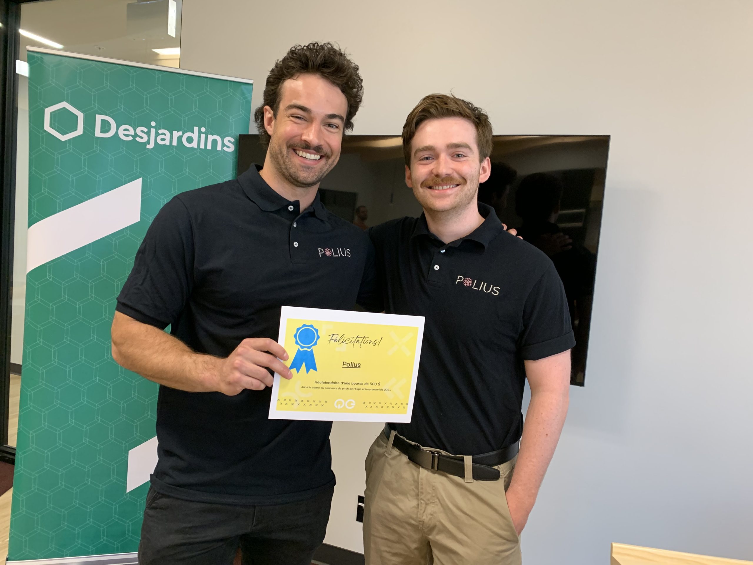POLIUS – représentée sur les photos par Charles-Alex Lavoie et Antoine Martin – développe un système innovant de pollinisation par vibration acoustique, imitant la vibration des bourdons afin de polliniser les fleurs de tomates. Cette solution sans contact réduit les risques de propagation de pathogènes en serre, un enjeu majeur de biosécurité. De plus, en remplaçant les bourdons, parfois imprévisibles et capricieux, sa technologie assure une pollinisation constante et fiable, augmentant ainsi les rendements des producteurs.