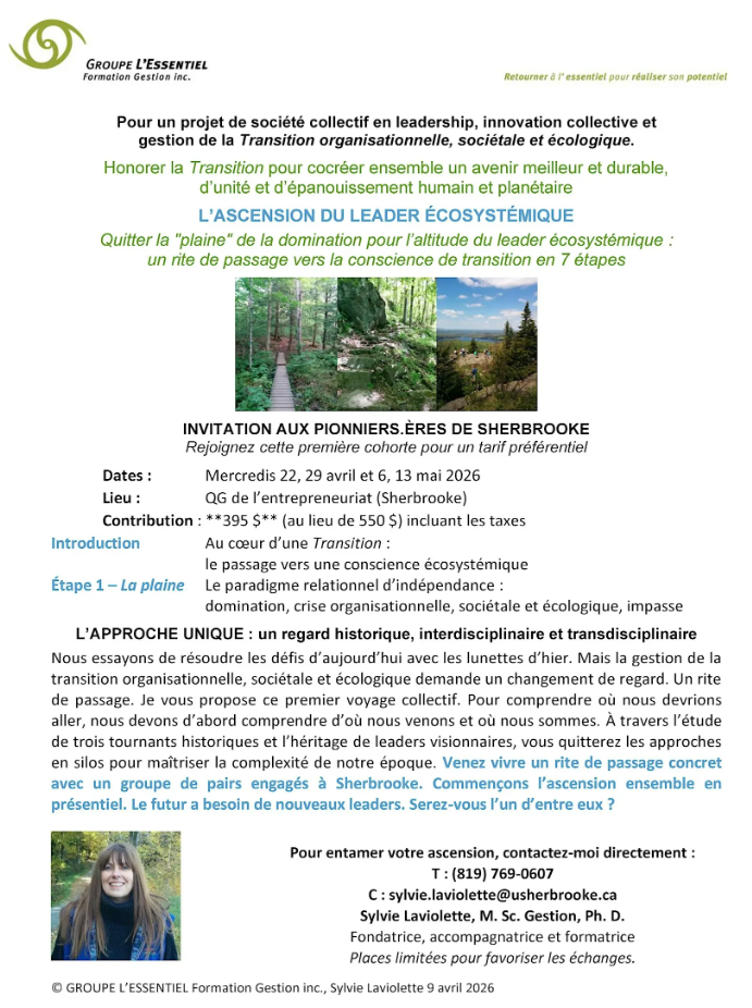 Cette première session à Sherbrooke marque le début d’un parcours ascensionnel en 7 étapes. Vous rejoignez une cohorte de pionniers qui cheminera ensemble pour intégrer durablement les principes du leadership écosystémique. Le parcours total représente 21 jours de formation. Pour honorer l’intelligence collective, le groupe décidera ensemble du rythme et des dates pour les étapes suivantes (prévues entre septembre 2026 et fin 2027).