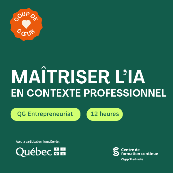 Cette formation s’adresse aux entrepreneurs, gestionnaires, travailleurs autonomes ou professionnels qui souhaitent comprendre et exploiter le potentiel de l’intelligence artificielle pour améliorer leur efficacité, innover dans leurs pratiques et prendre des décisions plus éclairées. À travers 7 blocs thématiques couvrant la gestion, le marketing, les ventes, les ressources humaines, les opérations et la finance, les participants découvriront des outils concrets, des cas d’usage adaptés à leur réalité et des exercices pratiques pour intégrer l’IA de façon stratégique, éthique et accessible dans leur quotidien professionnel.